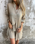 De set bestaat uit een button-down shirt met lange mouwen en een bijpassende short met hoge taille en is ideaal voor elke gelegenheid: brunch, ontspanning of een strandwandeling. De lichtgewicht stof zorgt voor een vloeiend, luchtig silhouet voor optimaal comfort en totale bewegingsvrijheid.